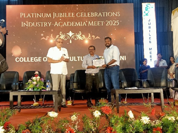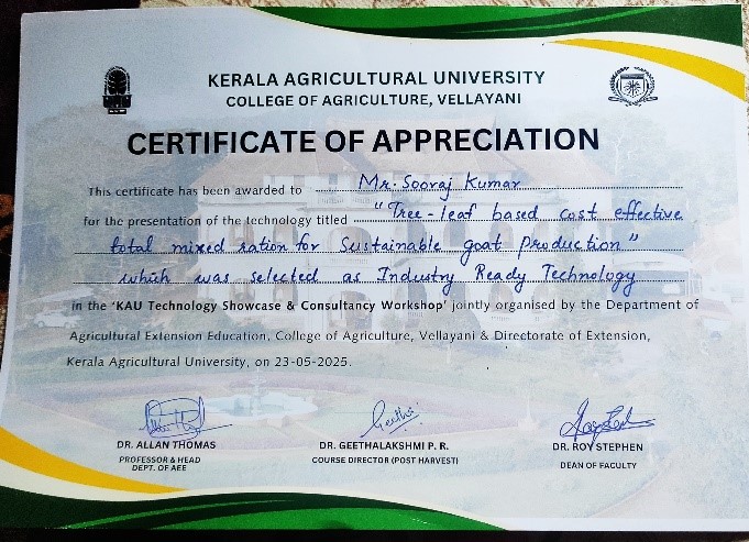 Mr Sooraj Kumar, a Ph.D. scholar in department of Silviculture & Agroforestry, College of Forestry, has been awarded as Industry Ready Technology for his project titled as “Tree-leaf based cost effective Total Mixed Ration for sustainable goat production” in the ‘KAU Technology Showcase & Consultancy Workshop’ jointly organised by the Department of Agricultural Extension Education, College of Agriculture, Vellayani & Directorate of Extension, Kerala Agricultural University, on 23-05-2025.